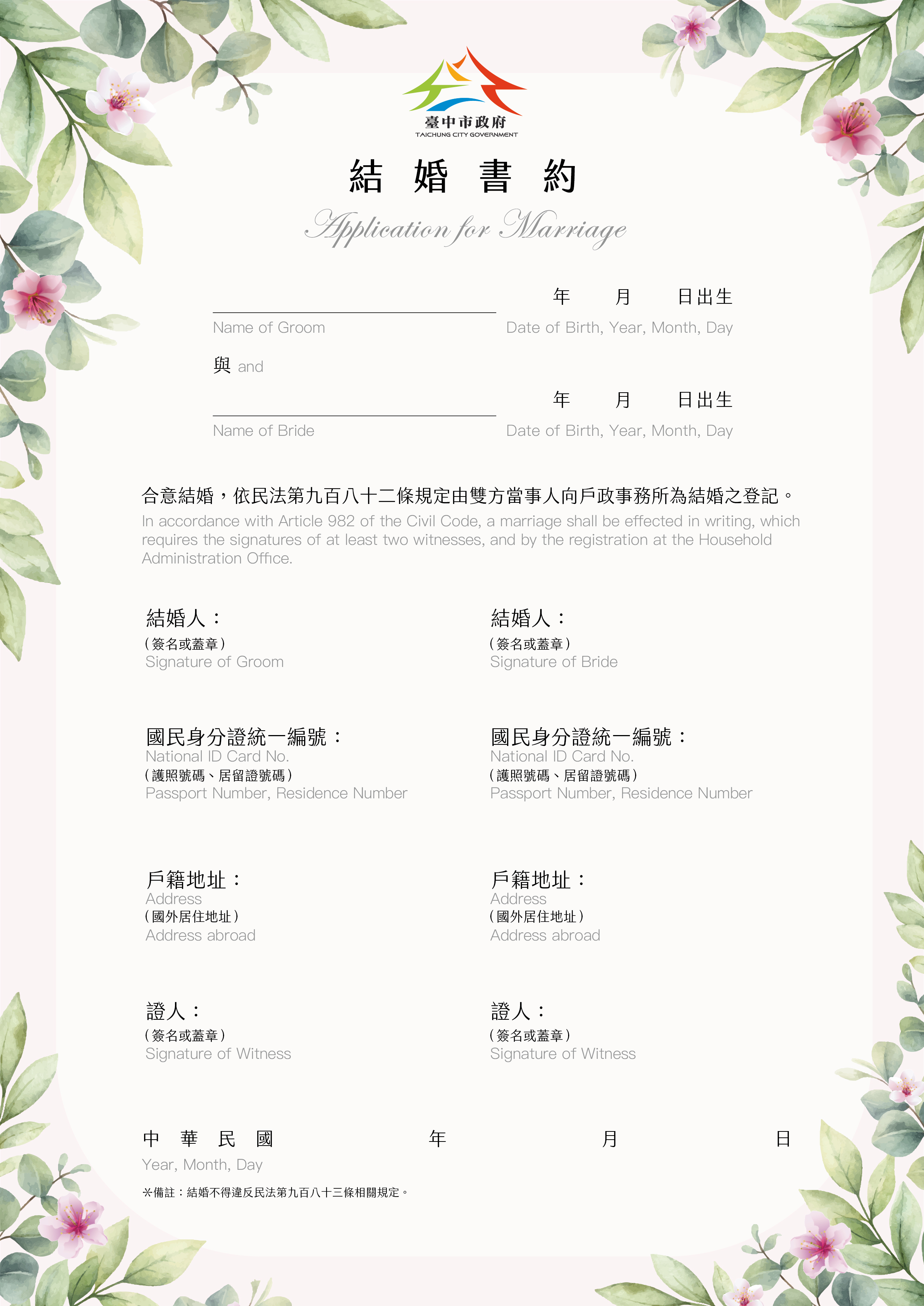 二、【臺中市政府專屬結婚書約-異性結婚版】為網站下載版本,市長落款及鈐印祝福精緻印刷版本,請逕洽本市各戶政事務所現場索取。